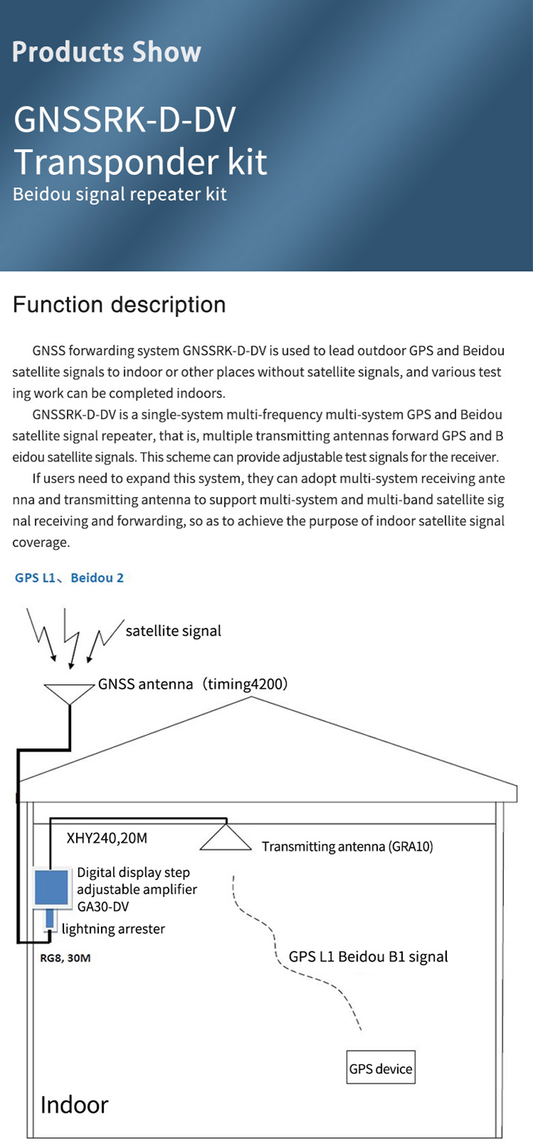 GNSS forwarding system GNSSRK-D-DV's main function is to lead satellite signals from the outdoor to the indoorWhere the internal or other satellite signals cannot be reached, all tests that should be completed outdoors can be completed indoors.