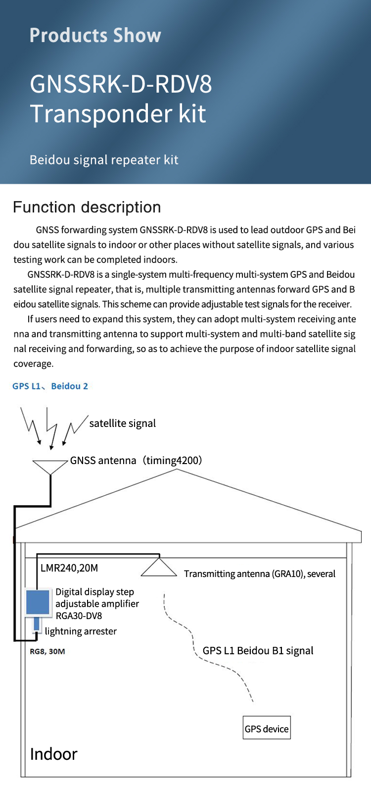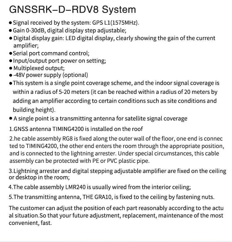 • GNSSRK-D-RDV8 is a GNSS repeater operates by receiving GPS/Beidou3 satellite signals with an antenna located outside the building and re-radiating the signal into the indoor area or covered space where satellite signal cannot reach.