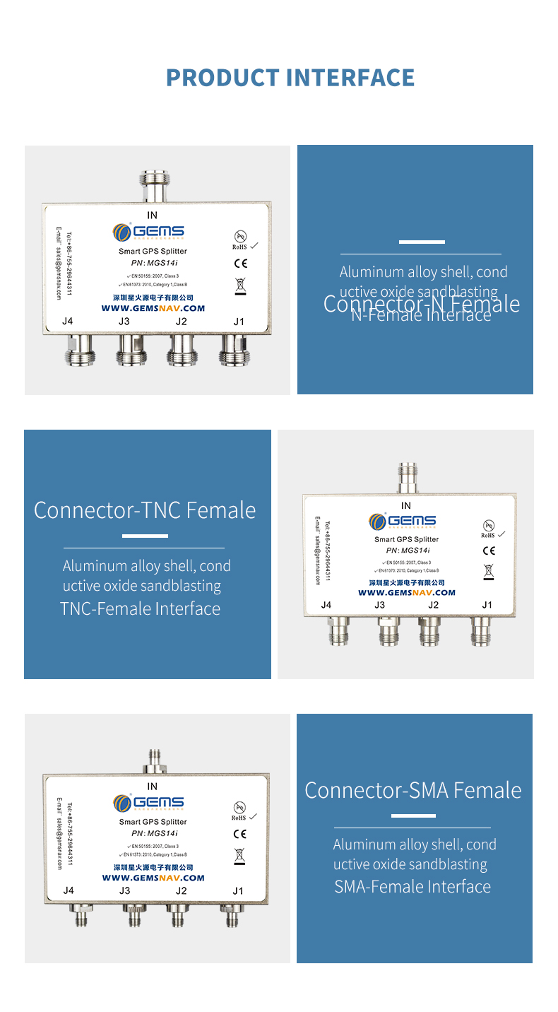 The MGS14i splitter requires that a DC voltage be applied to one or more of the RF output ports by ways of the RF connector center conductor.If DC voltages are applied to more than one of the RF output ports,the MGS14i pick‐&‐chose circuit will choose one of these DC input to power the active circuitry of the MGS14i and will also pass this DC voltage through the splitter to the center conductor of the RF input port.The DC voltage available on the RF input port can then be used to power the application’s active antenna.The DC voltages applied to the RF outputs that are not chosen by the pick‐&‐choose circuitry will be automatically switched through an RF choke to 200Ohm DC loads.The DC voltages may be applied to any or alll of the RF outputs;however,the pick‐&‐choose circuit will always select the DC voltage ont the lowest numbered RF port that has a DC voltage applied to power the MGS14i and the application’s antenna.If the choosen DC input were to be removed or fail,the pick‐$‐choosen circuit will automatically switch to the next higher mumbered RF port to which a DC voltage is applied.
