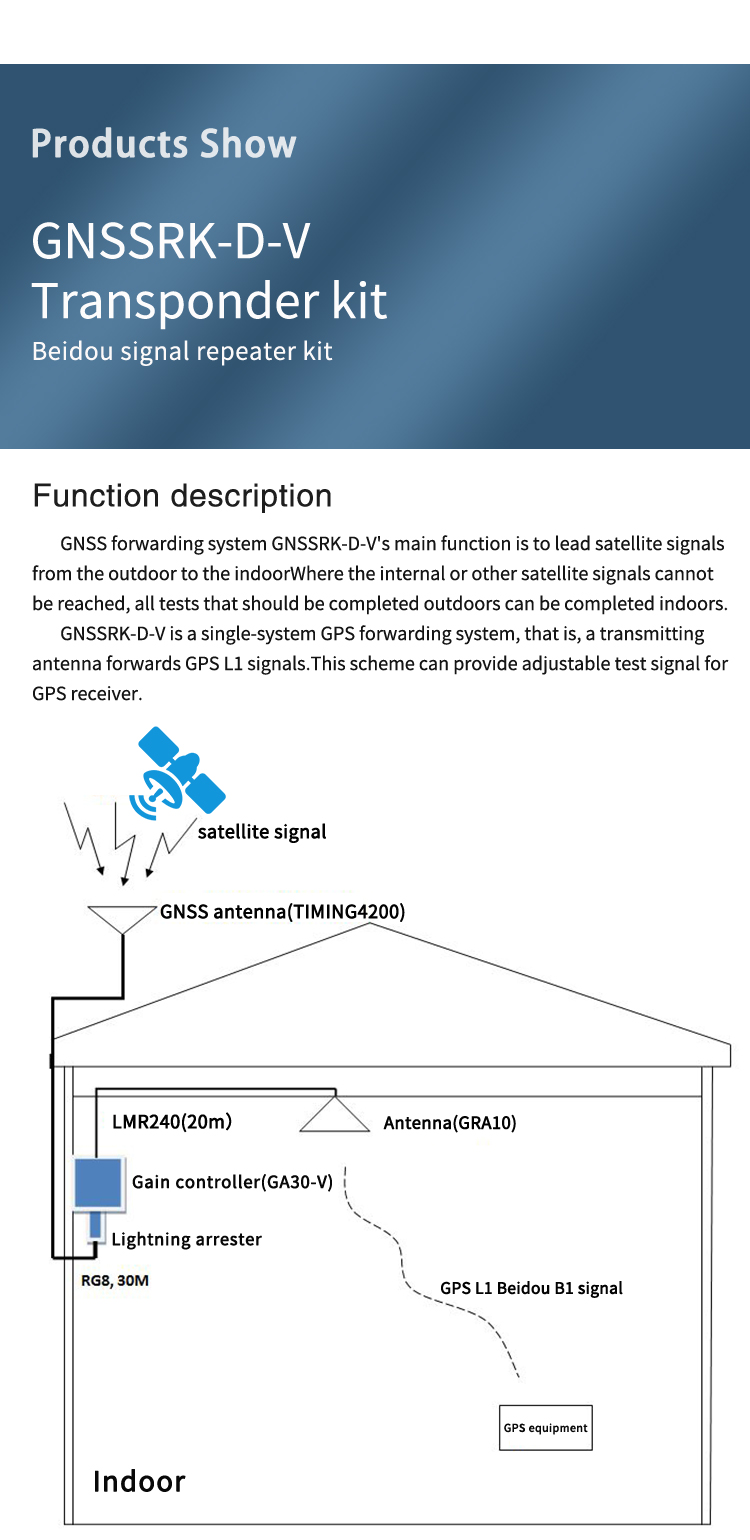 GNSSRK-D-V is a single point GPS & Beidou repeater, one transmitting antenna transmit GPS L1 & Beidou3 B1 signal.