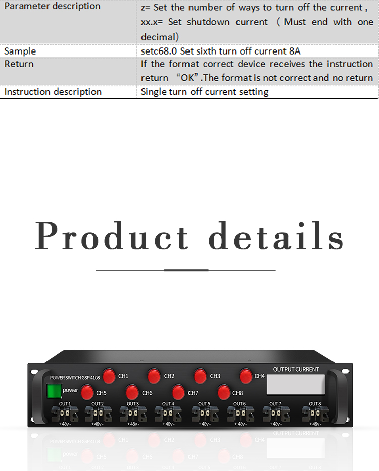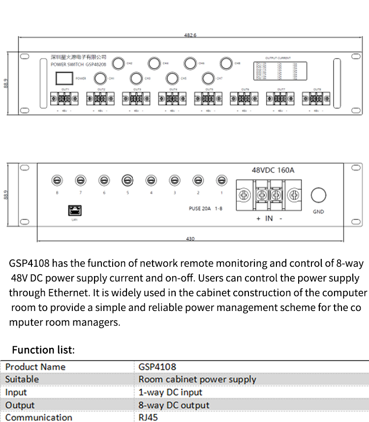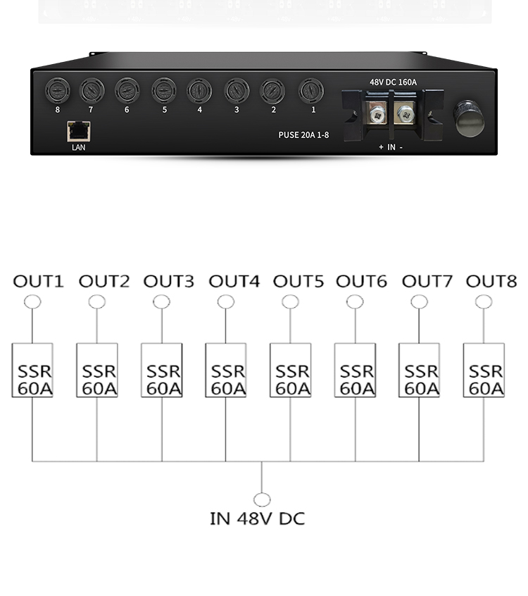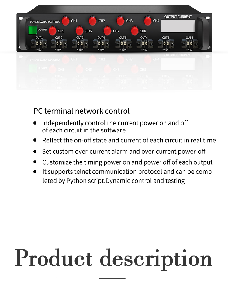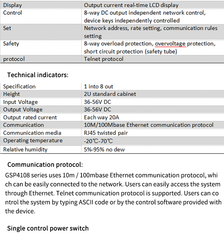 GSP4108 is a 48V DC 1 into 8 out power supply system. Controlled by 8 high-current solid state relays 8 output DC off, output current real-time monitoring of each circuit, and set the custom current alarm.
