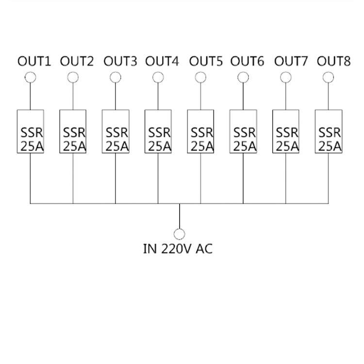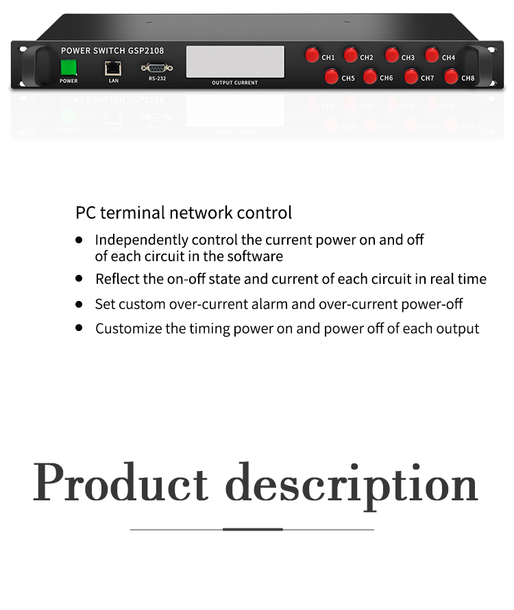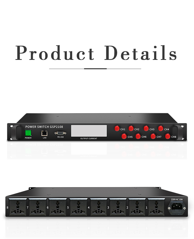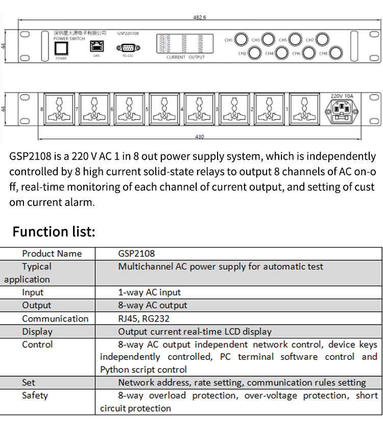 GSP2108 is a 220V AC 1 into 8 power supply system, controlled by 8 high-current solid-state relays 8 output AC off, output current real-time monitoring, and set the custom current alarm.
