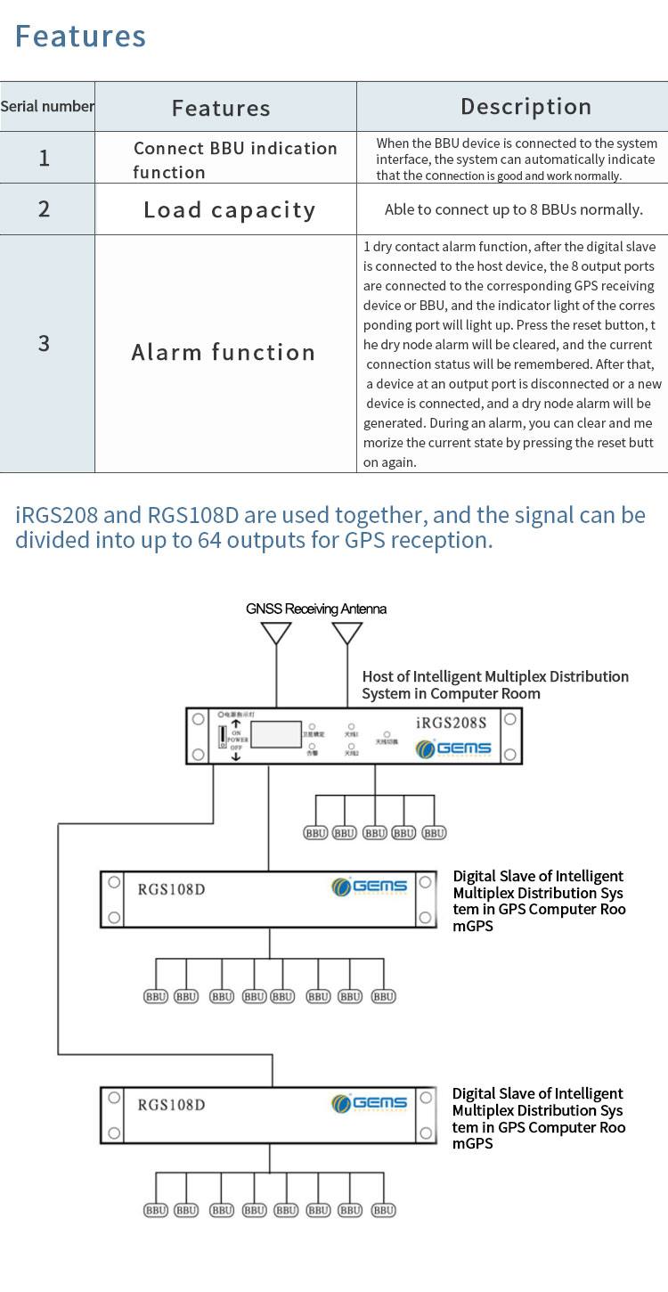 3.3 Connection BBU indication function: GPS signal room intelligent multi-channel distribution system device signal output terminal is connected to the GPS signal input end of BBU. After the GPS input end of BBU is connected to the clock synchronization system device output end, the clock synchronization system device should have access status indication.