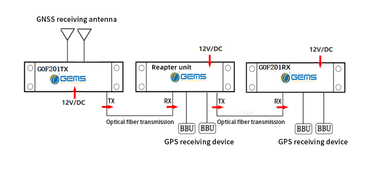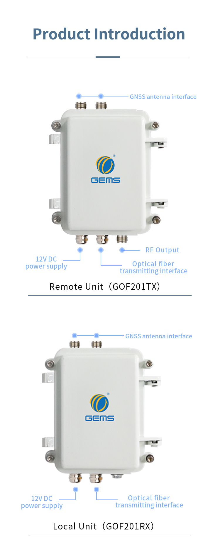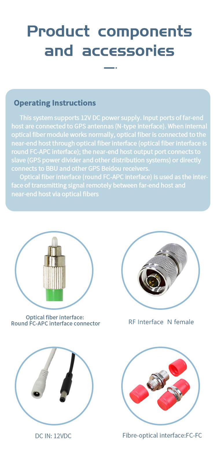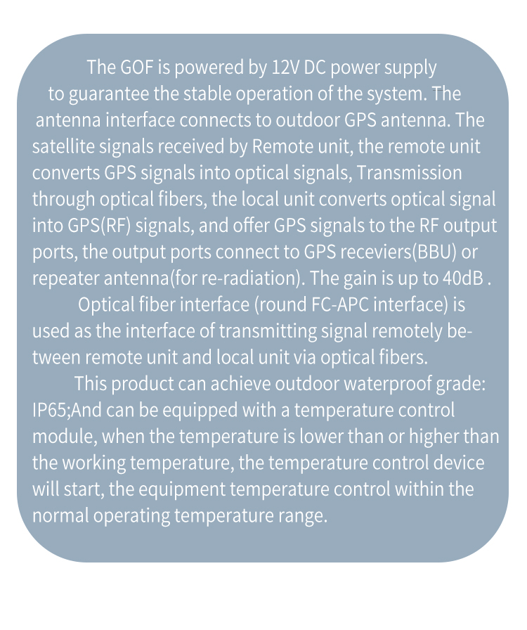 The GOF is powered by 12V DC power supply to guarantee the stable operation of the system. The antenna interface connects to outdoor GPS antenna. The satellite signals received by Remote unit, the remote unit converts GPS signals into optical signals, Transmission through optical fibers, the local unit converts optical signal into GPS(RF) signals, and offer GPS signals to the RF output ports, the output ports connect to GPS receviers(BBU) or repeater antenna(for re-radiation). The gain is up to 40dB .