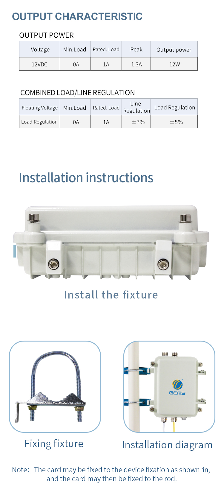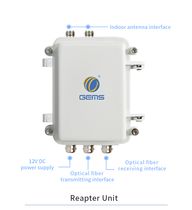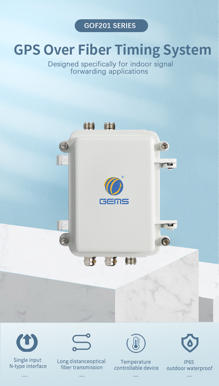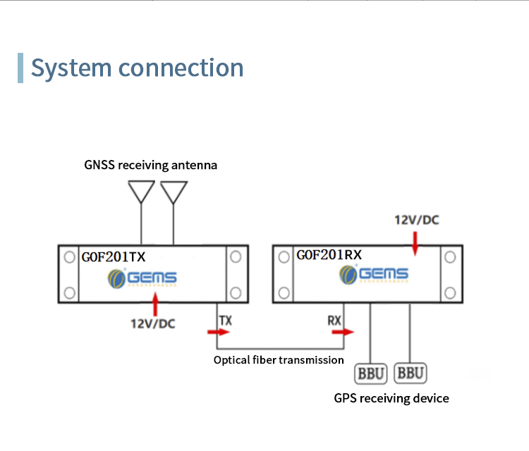 The GOF is powered by 12V DC power supply to guarantee the stable operation of the system. The antenna interface connects to outdoor GPS antenna. The satellite signals received by Remote unit, the remote unit converts GPS signals into optical signals, Transmission through optical fibers, the local unit converts optical signal into GPS(RF) signals, and offer GPS signals to the RF output ports, the output ports connect to GPS receviers(BBU) or repeater antenna(for re-radiation). The gain is up to 40dB .