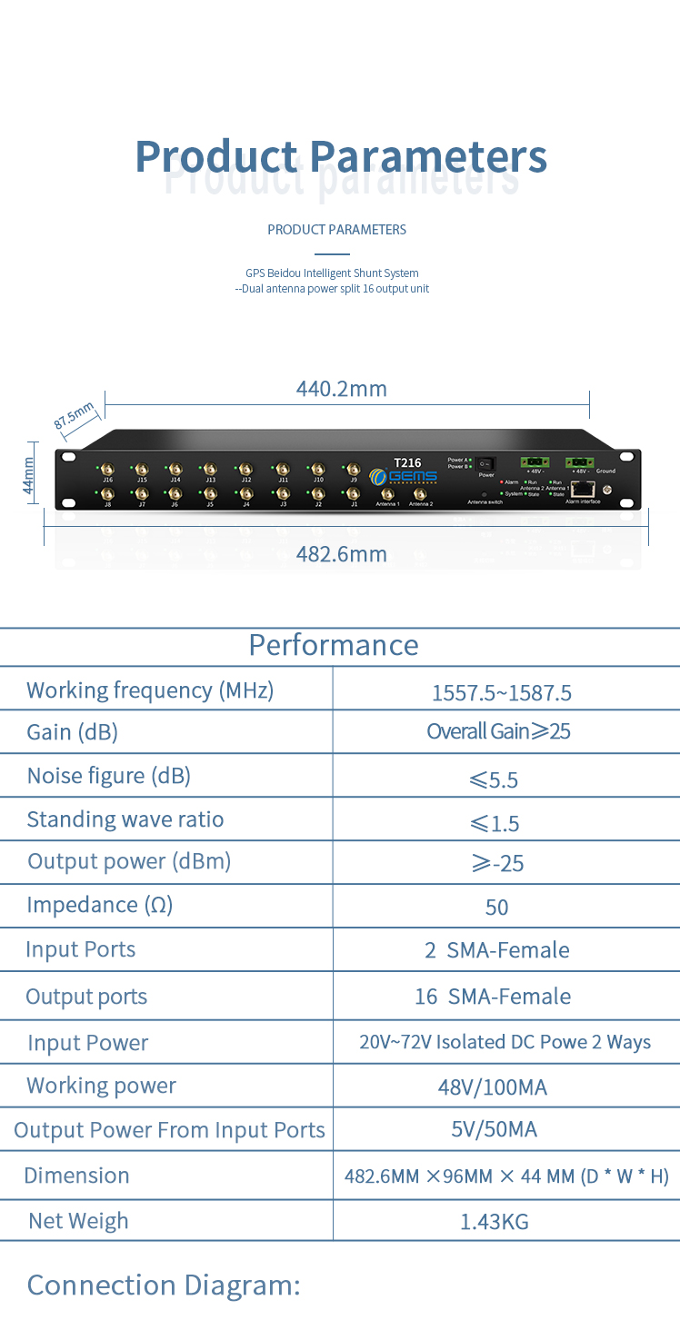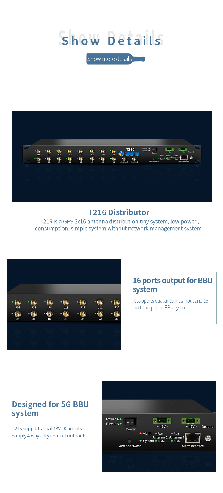 T216 is a GPS 2x16 distribution tiny system, low power consumption, simple system without network management system, it supports dual antennas input and 16 ports output for BBU system . Sharing the two GPS timing antennas. T216 is a splitter system for sharing gps antenna for 5G BBU systems. The T216 supports dual 48V DC inputs. Supply 4 ways dry contact outpouts. Designed for 5G BBU system.